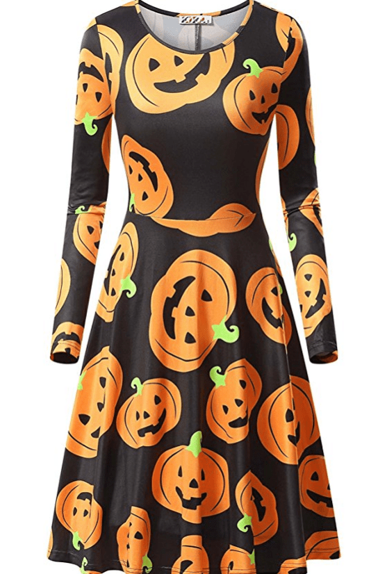 To me this is the perfect dress to wear with some black leggings to work, and I love how it comes in at the waist, and flows away from those hips, which is perfect for all us curvy gals out there! This dress also comes in a variety of Halloween themed prints and sizes. $18-20 at Amazon.